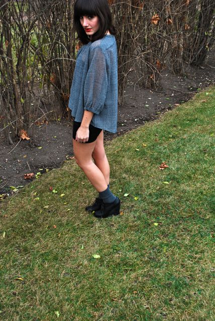 It seems as though my Pleasure Doing Business skirt goes with anything and everything, anytime and anywhere. It comes in dozens of colors and lengths, but I chose the 5-banded black combo. It is completely elastic, but completely comfortable. At night it looks good with a fitted tank tucked in, but I prefer it with a flouncy top, such as my IRO blouse from Paris, or an Equipment blouse (tucked in or out). I also love it with a chunky loose sweater and tights. My favorite oxford wedges (Shopbop) look so schoolgirl but so adorable with scrunched calf-length socks (mine are from Gap).
